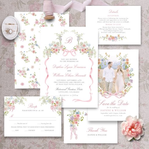 Bows and Wildflowers Return Address Label. These return address labels feature soft watercolor wildflowers accented with a delicate blush pink bow for a romantic, refined look. Inspired by a Victorian English garden, the floral arrangement feels airy and timeless. A beautiful finishing touch that coordinates seamlessly with a classic floral wedding suite.