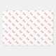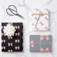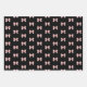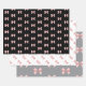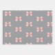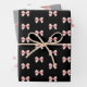 A pattern of pink bows adorn this wrapping paper. Each sheet has a slight variation on the pattern on a white, black and grey background.