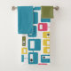 This towel set has a green washcloth, a turquoise hand towel, and a bath towel with a mid-century modern design of rounded rectangles, some of which are attached and some of which have starbursts, in retro colours of red, gold, green, and turquoise. If you like the design but prefer different colours, message me.