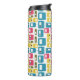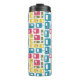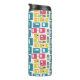 This thermal bottle has a mid-century modern design of rounded rectangles, some of which are attached and some of which have starbursts, in retro colours of red, gold, green, and turquoise. If you like the design but prefer different colours, message me.