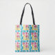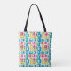 This tote bag has a mid-century modern design of rounded rectangles, some of which are attached and some of which have starbursts, in retro colours of red, gold, green, and turquoise. If you like the design but prefer different colours, message me.