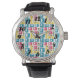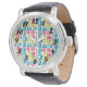 This men's watch has a mid-century modern design of rounded rectangles, some of which are attached and some of which have starbursts, in retro colours of red, gold, green, and turquoise. If you like the design but prefer different colours, message me.