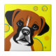 Vector Boxer dog art with light orange circles and yellow background colour.