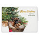 On this Holiday card, a Boxer dog lays in his wicker basket bed in front of a decorated Christmas tree. Also behind the basket is a pretty red holly berry and pine cone bouquet. The gold script text at the right says "MERRY CHRISTMAS", with HAPPY NEW YEAR in green below it. All the text, inside and out, may be easily changed to anything you'd like. You can see more Boxer dog images, as well as other breed images, at Dog Village.