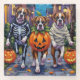 Adorable Boxers dressed in playful Halloween costumes carry pumpkin buckets while trick-or-treating under the moonlit sky. This festive design highlights the breed’s athletic build, expressive face, and fun-loving personality, perfectly capturing the spooky yet cheerful atmosphere of Halloween night. A delightful celebration for dog lovers and Halloween fans alike.