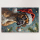This photorealistic digital painting captures a fawn Boxer, wearing a tilted Santa hat, in a moment of playful mischief as it attempts to bat at a sparkling Christmas ornament hanging from the tree. A detailed and endearing holiday design.
