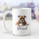 A morning coffee mug with a boxer dog with custom name in script style. "May your Coffe be stronger than your dog's Attitude" is written on the back. Perfect gift for dog owners that have a dog with an attitude and also love coffee.