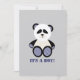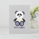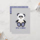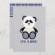 A modern stylish baby shower invitation featuring an illustration of a panda accented with blue gingham paws and ears. Matching trim at top of opposite side. All text is customisable.