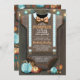 Rustic Fall Boy Baby Shower Invitation features Bow Tie Burlap Wood and Orange and Baby Blue Pumpkin Illustrations