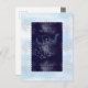 A cute baby boy shower invitation on a pale blue cloudy and starry sky with a dark blue arch enclosing a little blue elephant.