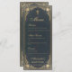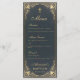 This elegant vintage baptism menu with a vintage air, recommended for a boy's christening, has on both sides a golden baroque decorative frame on a dark blue background. The name, the title "Menu" and the subtitles are written in an elegant calligraphic script. All text can be personalized and has a golden color similar to the golden frame. There is a (faux) gold cross above the text.