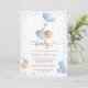 This adorable baby shower invitation features a boy teddy bear being flown by balloons with elegant script and modern text for your details. Back features teddy bear holding a balloon and text for a book request, or can be deleted for a clean look. Easy to customise by clicking "Personalise".