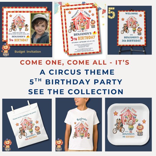 This festive and colourful Boy's fifth (or any year) Birthday Welcome banner features a fun filled circus theme -- with the main tent, a clown and circus animals. Matching party items can be found in the collection. Much to personalise to make appropriate for your own event. Any design questions, just send a chat and we'll be delighted to assist.