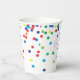 Confetti birthday / birthday boy party paper cups! Featuring your kid's party details and fun coloured circles in bright primary colours sprinkling all around these paper cups.