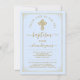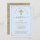 Boy blue and gold baptism invitations with beautiful gold cross and gold border background. This blue and gold baptism invitation is easily customised for your event by adding your details. You can also change the colour of the text and background to whatever colour you prefer. You can remove the glitter print background from the back side and add the colour of your choice to this beautiful versatile invitation.