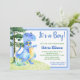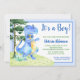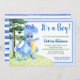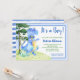 Dinosaur baby shower invitations with adorable watercolor dinosaur wearing a cute bow tie on a watercolor blue stripe and outdoor background. This dinosaur baby shower invitation is easily customised for your event by simply adding your details.