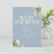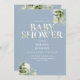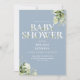 An elegant baby shower invitation featuring elegant typography and pretty botanical greenery foliage on a dusty blue background and your QR code on the reverse. Designed by Thisisnotme©