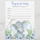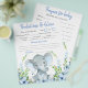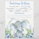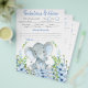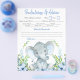 Boy baby shower games with cute baby elephant on a blue floral greenery background. These elephant baby shower game flyers are double sided with two different games.
