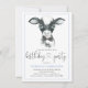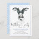 Farm birthday party invitations with cute watercolor baby cow calf wearing a bow tie on a blue polka dot background. These adorable cow birthday party invitations are easily customised for your event by simply adding your details. You can also add a background colour.