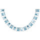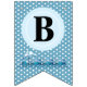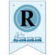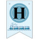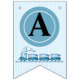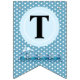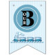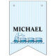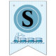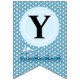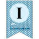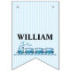 Your Birthday Boy is tuning one! This blue train themed bunting flags are just the thing to ramp up the fun. Flags have alternating white stripes on a light blue background and white polka dots on a dark blue background. The flags proclaim that "Our Birthday Boy is Turning One Today1!". Three of the flags are customised to include the birthday boy's first, middle and last names