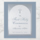 A simple but modern religious design. On a dusty  blue rectangular background, it has a faux silver foil arch that has inside dusty blue text on white background. The occasion and the name are written in an elegant calligraphic script; the first line is arched text.