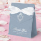 A dusty blue favour box for a boy's first communion. On the flap, it has faux silver foil crest with a cross in it.