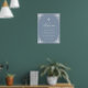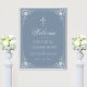 The background is dusty blue. It has a vintage ornate frame with faux silver foil decorations in the corners. Above the text there is a faux silver cross. The word Welcome is written in an elegant calligraphic script, the rest in caps. All text can be personalised and has a silvery grey colour similar to the frame.