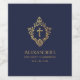 An elegant religious design with a cross in a vintage crest, recommended for a boy's first communion. The crest and the cross are faux gold foil, the background is navy blue. Under the crest, there are the name, occasion and date in golden caps.