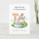 This watercolour first Easter card is suitable for a grandson or son. The design includes butterflies, floral elements, and a bunny rabbit sitting in an easter egg basket. Baby's name is included on the front of the card, as well as the inside of the card.