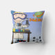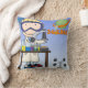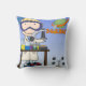 Boy in Science Lab pillow, features a boy scientist in a lab coat and safety goggles in the lab working with beakers, a microscope, and test tubes.