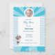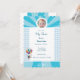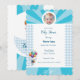 Cheerful baby shower invitation with white and blue colour. Topped with a flying baby carried in balloons. A beautiful keepsake of the most beautiful occasion