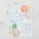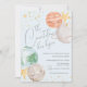 Adorable space baby shower invitation with pastel planets, moon, stars and faux gold accents. Perfect for a boy outer space galaxy themed baby shower.