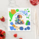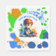 Birthday party paper napkins. Cute little anime boy playing video games with a blue, orange and green paint splatter background done in an ai watercolor style illustration.
