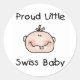 Baby nationalities T-shirt with a baby boy and kid style text that reads 'Proud Little Swiss Baby"! Our Proud Little Swiss Baby t-shirt is a great gift for the new baby boy.