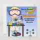 A boy with safety goggles, test tubes, beakers, and areas you can customise before ordering on colourful science theme birthday party invitations! If your child loves science and wants a mad scientist birthday party you'll love our easy to customise science birthday invites!