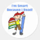 A stick figure boy wearing a red baseball cap holds a stack of books and a big blue pencil, and blue text reads "I'm Smart Because I Read!". This cute reading theme T-shirt, tote bag, mug, mousepad, stickers, buttons, and other items promotes reading in children!