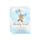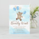 This charming baby boy's baby shower invitation features a cute watercolor teddy bear, blue balloons, and sky. It says We Can Bearly Wait in stylish script typography. It is easily customizable. Original Watercolor © Michele Davies.
