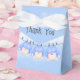 Cute baby boy triplets wearing blue PJs hanging on a clothesline with sky and cloud background for thank-you baby shower favours