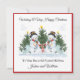 This Christmas card is suitable for twin boys on their first, second or third Christmas. The design includes a red border outline, light blue snowflakes, watercolour Christmas trees, candy canes, presents and twin snowmen.