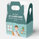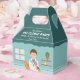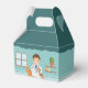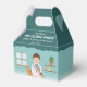 Celebrate a veterinarian themed birthday party with this cute favor box designed by Destei. The design features a fun cartoon illustration of a young boy veterinarian standing behind a gray examination table with an orange cat and a brown and white puppy, ready to care for his furry patients. He wears a white coat, matching blue scrubs and a stethoscope around his neck. He has brown hair and a happy expression.