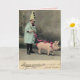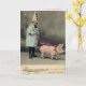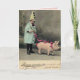 Young boy decked out in elaborate outfit and flowered leash and collar for his piglet asks if the hat is "too much". Delete striped background on inside if you prefer a blank white background. Feel free to change the text, which now reads: How's the hat look with this outfit? Yes? No? Too much?