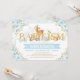 Whimsical woodland themed baptism invitation in blue and gold featuring whimsical forest animals: deer, bunnies, squirrel and a pretty bird