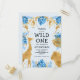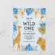 This "wild one" jungle safari themed boy's first birthday party invitation postcard features gold faux foil animals (giraffe, lion and monkeys), gold and blue jungle foliage, and a sprinkling of gold confetti on a pale blue background. Add the name of the birthday boy and party details in black text on the front and your return address on the reverse.