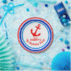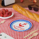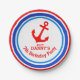 Bold anchor themed birthday personalised disposable paper plates, featuring your own name a red anchor graphic design. Personalise with your own birthday boys name and age. Currently reads Ahoy Danny's 7th Birthday Party. Ideal for a kids nautical birthday. Designed by Sarah Trett.