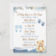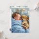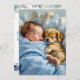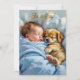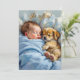 A cute baby shower invitation for a boy's baby shower. A sweet newborn baby boy taking a nap with his little puppy. The colours are blue and brown for this invitation.