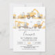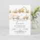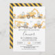 Cute little boy's construction themed birthday invitation featuring various trucks and construction vehicles in two rows at the top of the design.