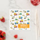 A colourful construction vehicles pattern napkin to match that construction theme birthday party! The napkin comes with a pattern constructed using many construction elements like a cute red and yellow dump truck carrying the debris, an orange excavator, a green front loader pushing dirt, a blue concrete mixer, orange and white cones and yellow and black construction zone barrier. Personalise with party message.