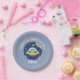 This cute and trendy boys birthday paper plate design features a cute space alien cartoon, with a rocket ship, aliens, stars and moon, and can be personalised with your kids name. The perfect blue galaxy themed addition to your little one's first, second or third birthday!