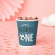 This cute and modern sports-themed kids birthday paper cup design features a blue superstar sports illustration, with a soccer ball making up the word ‘one’. The cup can be personalised with your boys name, and date of the party. The perfect sports-themed addition to your child's first birthday.