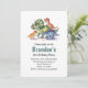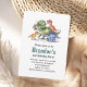 This adorable kids dinosaur birthday party invitation design has four realistic watercolor dinosaurs in the centre, one being a T-rex. These dinosaurs are green, blue, yellow, and red. They are modern yet cute. There is space to add your child's name, info about the party, RSVP info, and more. Enjoy!